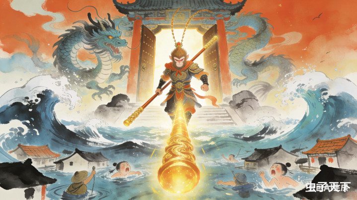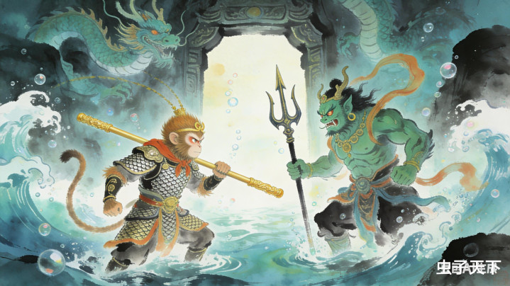 这石猴即是孙悟空,刚在花果山称了王,嫌手里的刀枪不趁手,听老猴说东海龙宫有宝贝,立马一个筋斗翻来了。